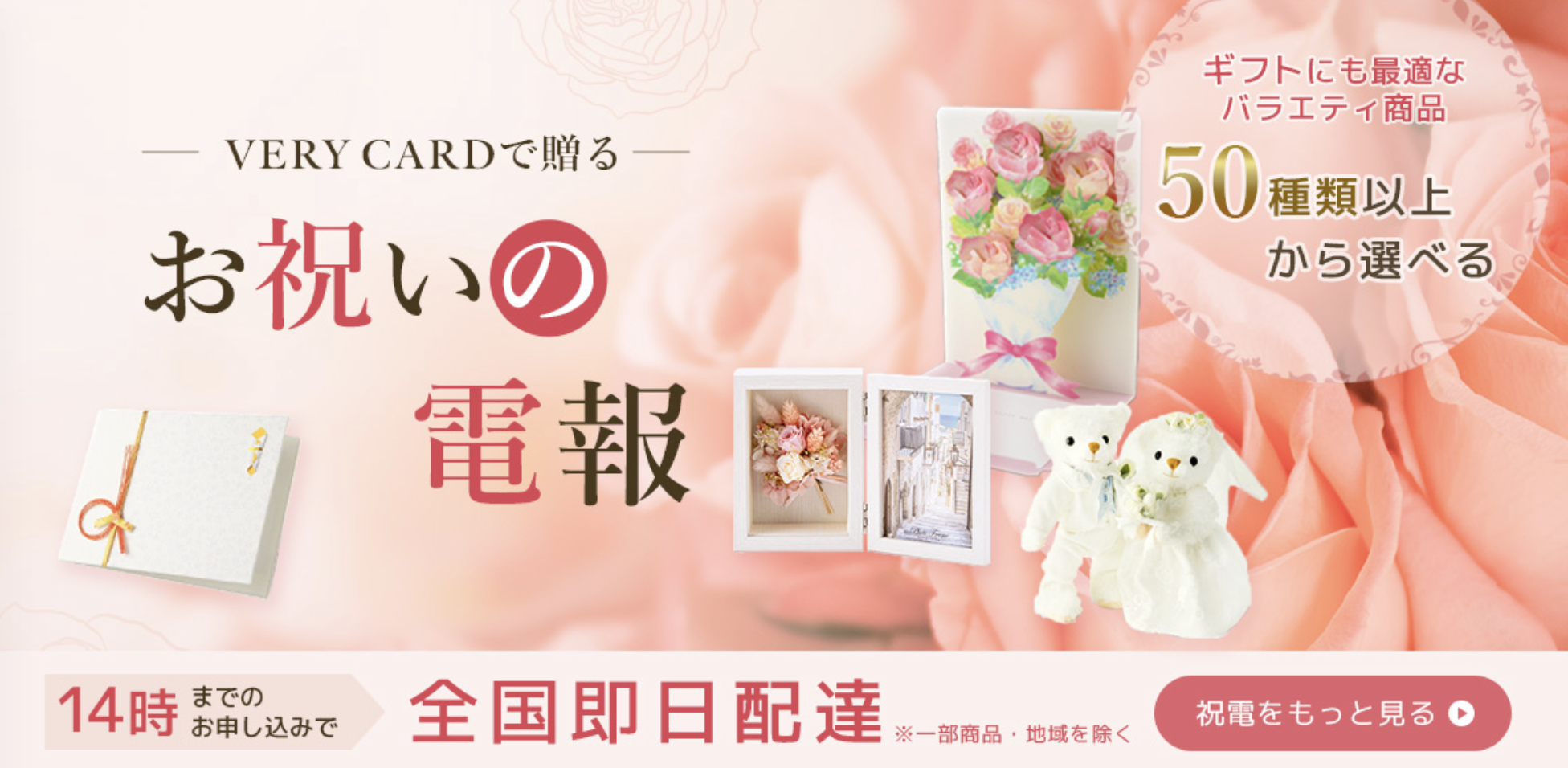 公式サイトはこちら VERY CARD インターネットから簡単にお申込みいただける電報サービスを提供しております。 100種類以上の豊富なラインナップからお選びいただけるカードタイプに加え、 ぬいぐるみ、プリザーブドフラワー、フラワーギフト、さらに長い間皆様に愛され続けている リカちゃんがドレスやメイクにまでこだわり、オリジナルリカちゃん電報となって登場するなど、 多彩な商品を取り揃えています。 商品名 VERY CARD カテゴリ ギフト